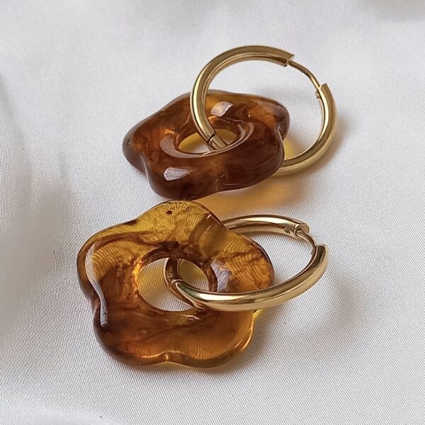 Add a warm and sophisticated touch to your jewellery collection with these beautifully designed brown tortoiseshell flower hoop earrings. Featuring organic flower-shaped charms in rich amber and brown tones, these earrings bring together natural inspiration and modern design. The tortoiseshell effect creates a unique marbled pattern, ensuring that each pair has its own subtle variation, adding to their charm and individuality.