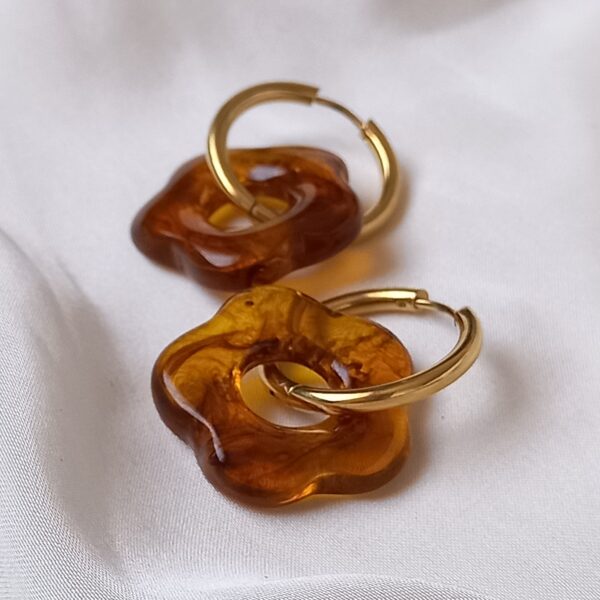 Set on classic gold hoops, these earrings offer a perfect balance of timeless elegance and contemporary style. The glossy finish enhances the depth of colour, while the floral silhouette adds a soft, feminine element. The combination of warm hues and gold detailing creates a versatile accessory that complements a wide range of outfits and colour palettes.
