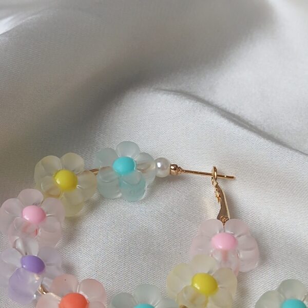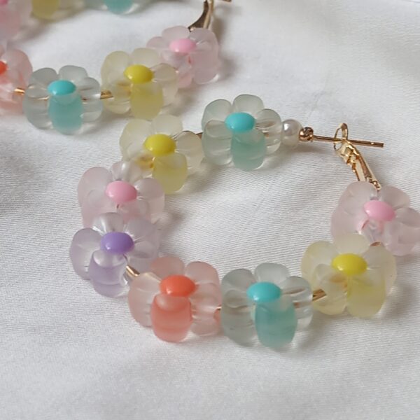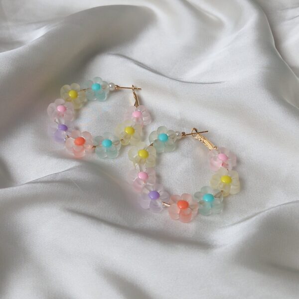Add a cheerful pop of colour to your jewellery collection with these beautifully designed pastel daisy hoop earrings. Featuring a delicate arrangement of small translucent flower beads in soft pastel shades, these earrings bring together playful charm and feminine elegance. Each daisy is accented with a contrasting centre, creating a bright and eye-catching design that feels both fun and stylish.