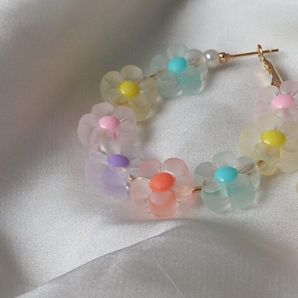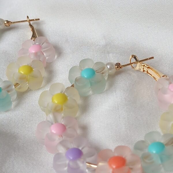 Playful pastel daisy hoop earrings with colourful translucent flowers and gold detailing. Lightweight, fun and perfect for adding a cute, vibrant touch to any outfit.